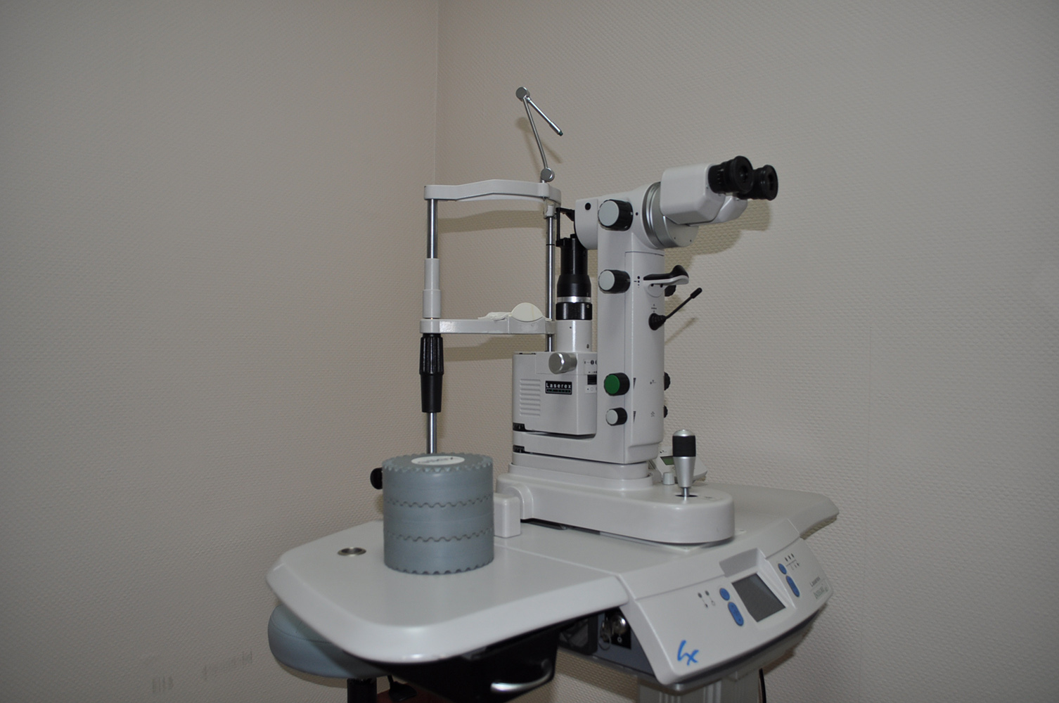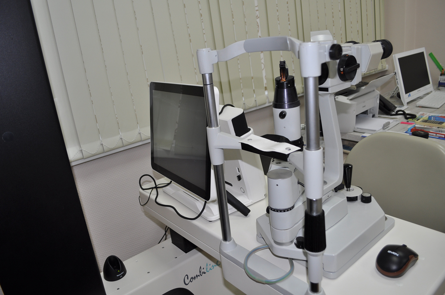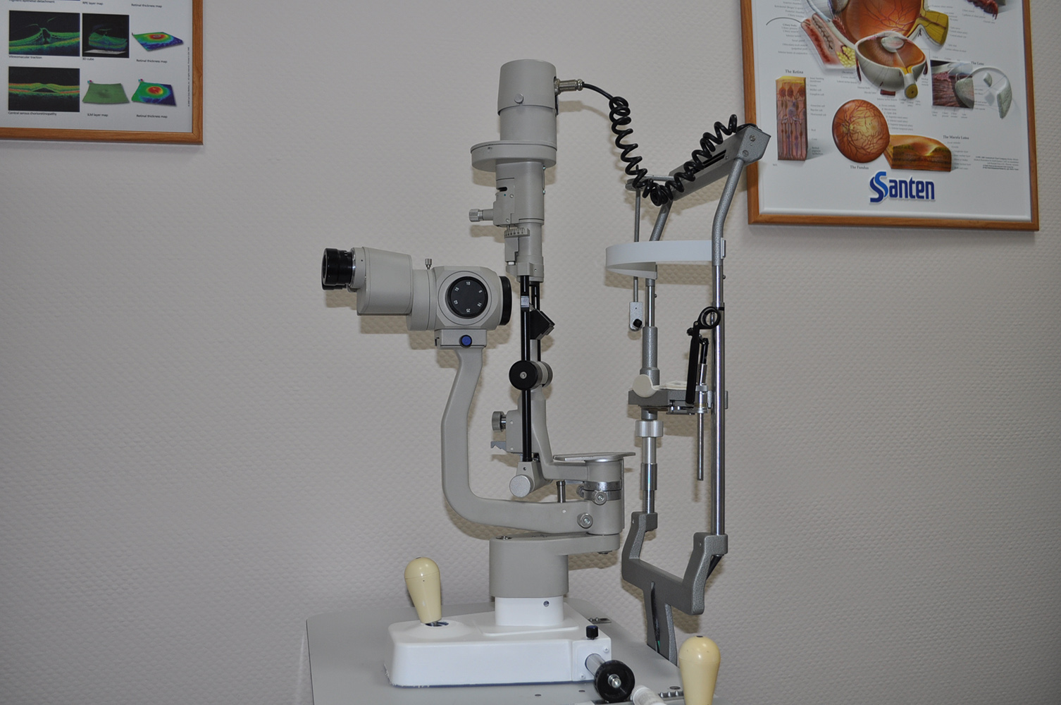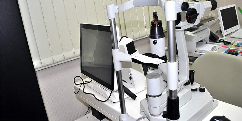 Biomicroscop, lampă cu fantă, proiector și tonometru de aplanare Goldmann.